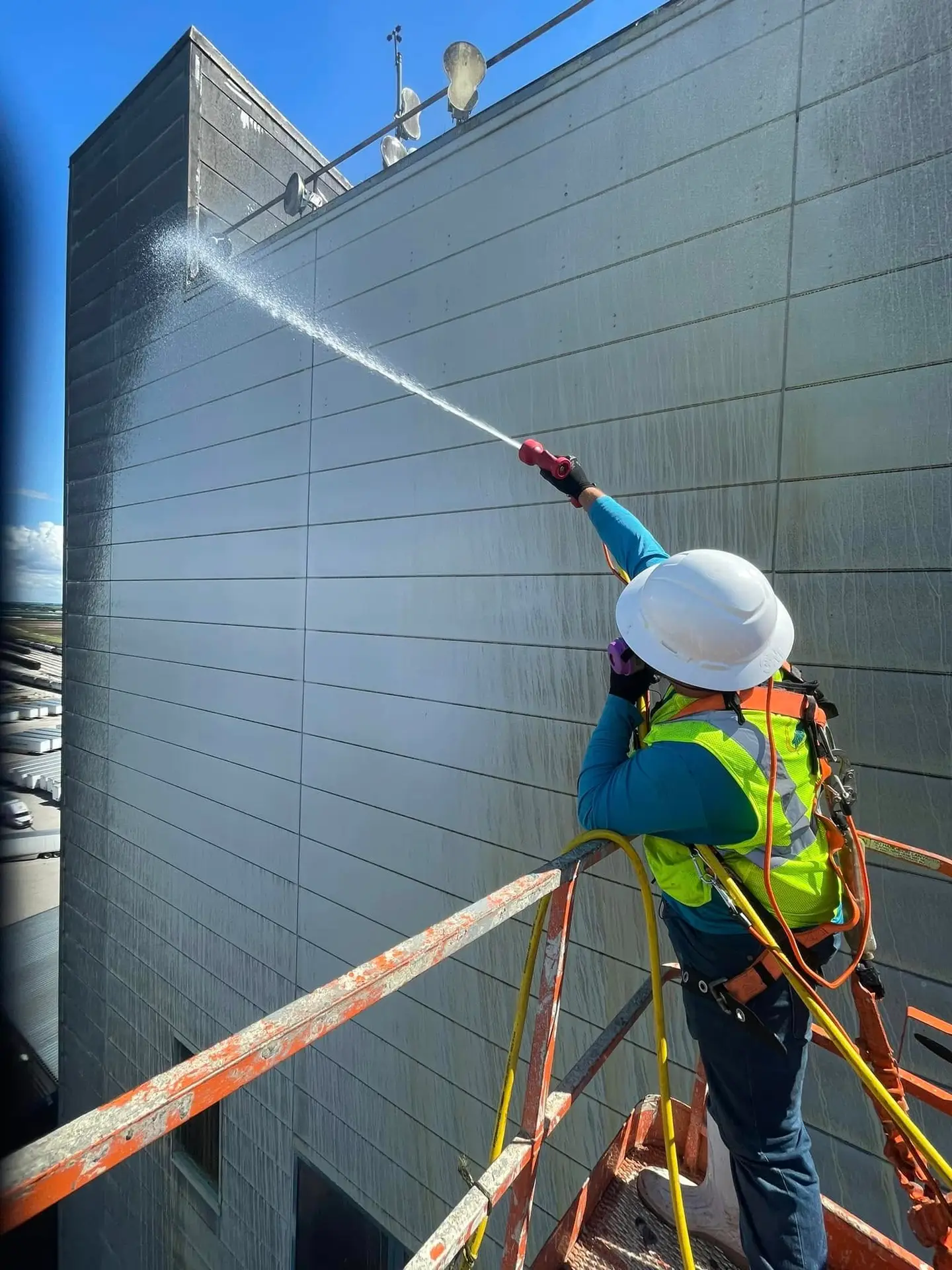OakRise delivers specialized exterior cleaning for commercial and multifamily properties — safely renewing building facades made of EIFS, brick, stucco, fiber cement, and other materials. Our methods combine controlled pressure, soft-wash chemistry, and field-tested safety systems to restore surfaces without damage.