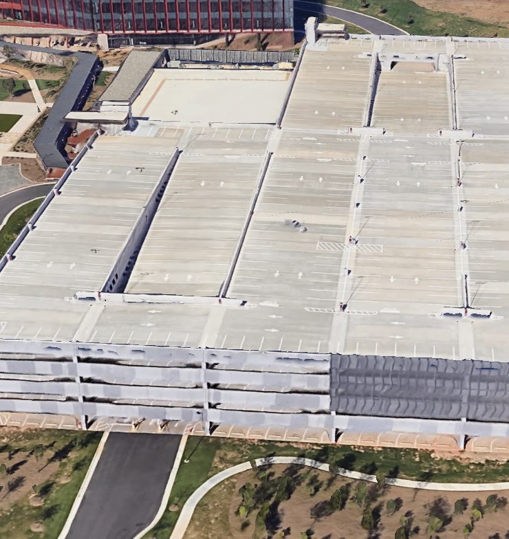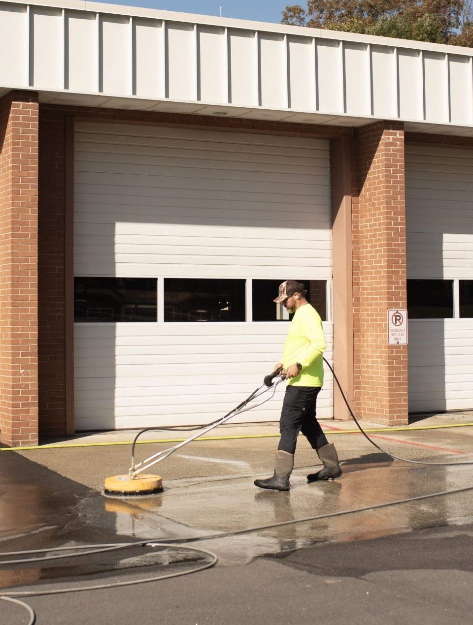 Parking decks are cleaned using high-flow, controlled-pressure equipment to remove hydraulic oil, tire marks, and organic debris. Techniques avoid damage to coatings and concrete.